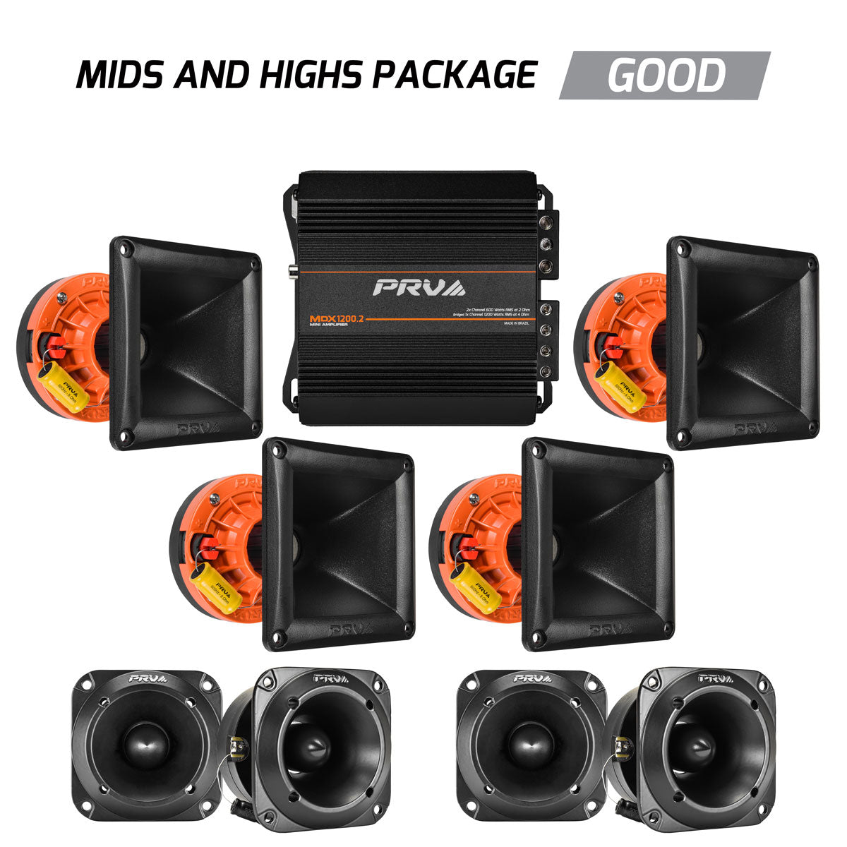 Combine this bundle with any 6.5″ and 8″ loudspeakers when building a stuntwall or custom door panel! A combination of midrange (vocals) Horn drivers and Super tweeters will cover all your vocals and highs with a high output, so you can hear them from a distance.