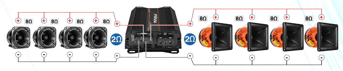 Each horn drivers and tweeters will be wired together in parallel separated on each channel of the amplifier. Amplifier has two RCA inputs – CH1 and CH2, make sure to have your Crossover / DSP signal inputs in the right channel to provide the proper frequency range for each component.