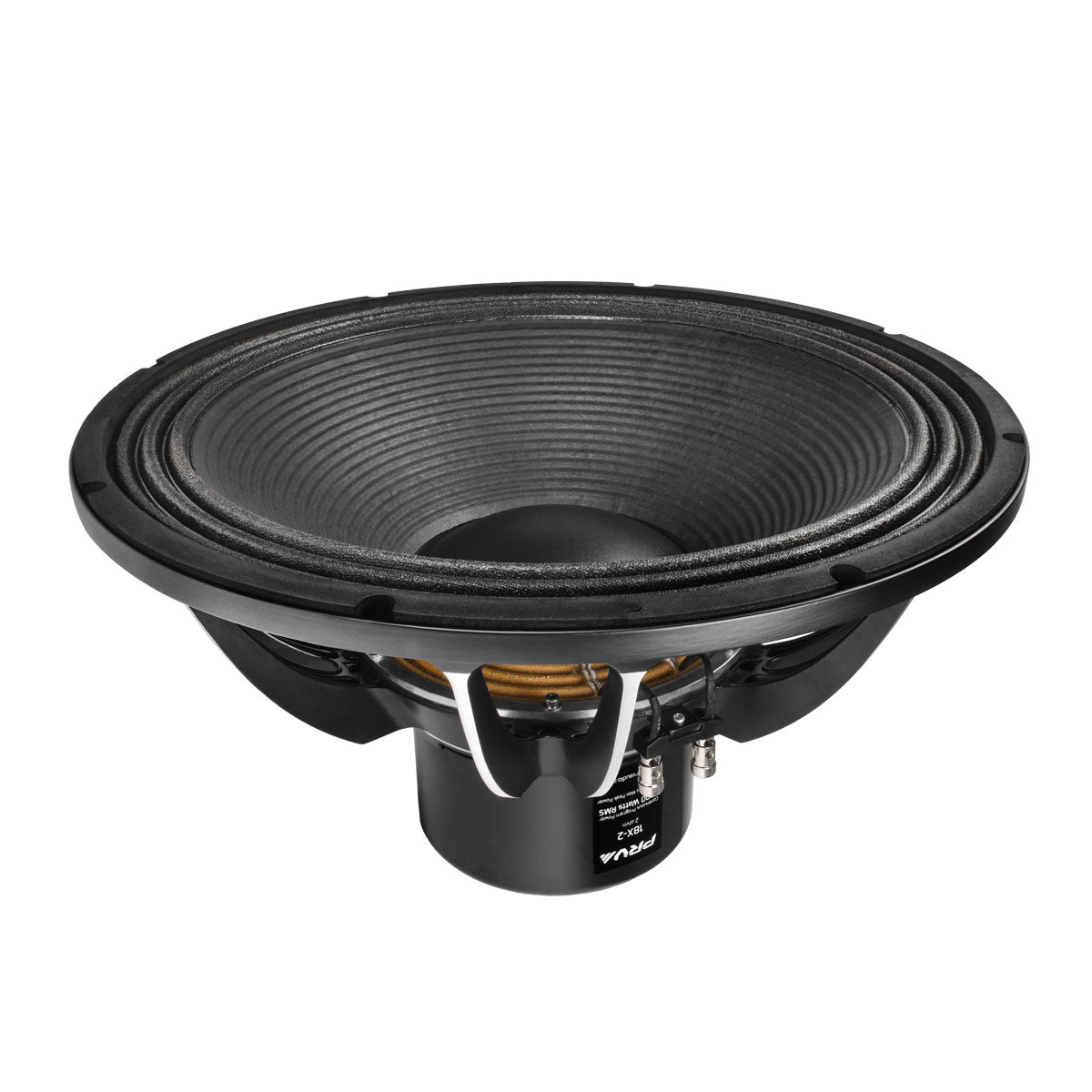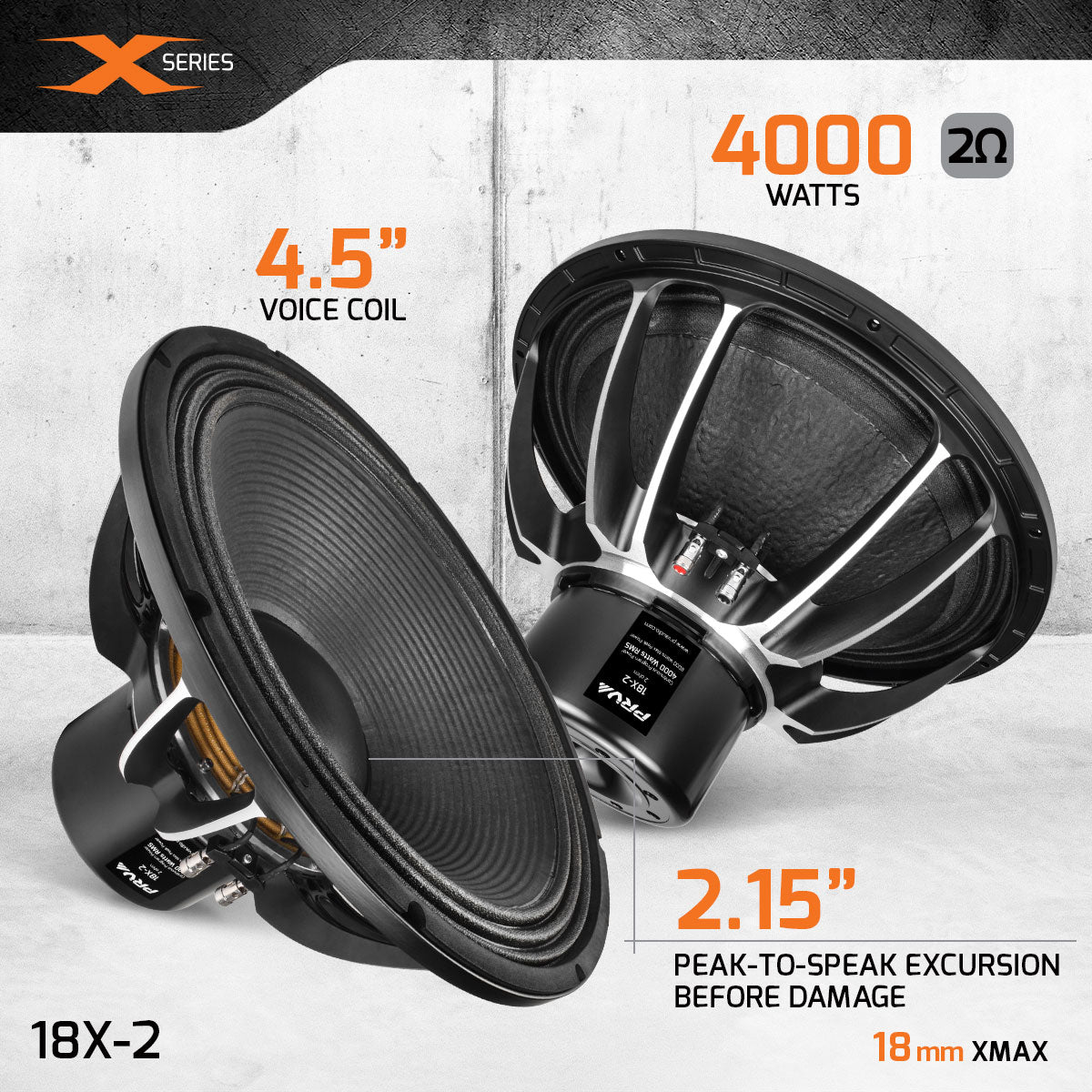 The 18X-2 is an advanced, high-strength Neodymium subwoofer, featuring a 4.5” inside/outside copper coil with an unique Suspension, Reinforced Cone, Spider, Tensil Leads.