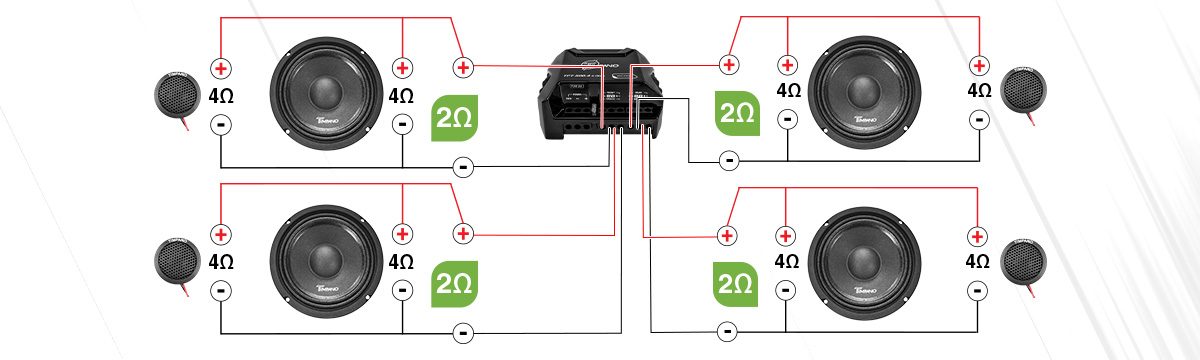 Each speaker and tweeter will be wired together in parallel on each channel of the amplifier. If you wire one speaker per channel, you’ll have enough power for both, but make sure you set the crossover on the amplifier so that the speakers have the right frequency range.