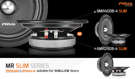 The MR SLIM series was designed as PRO Audio On Wheels solution for shallow doors, featuring an Aluminum Phase Plug (Bullet). This mid is built like a professional midrange loudspeaker, but it has been designed for use in the mobile audio market, as we called it Pro Audio On Wheels®!