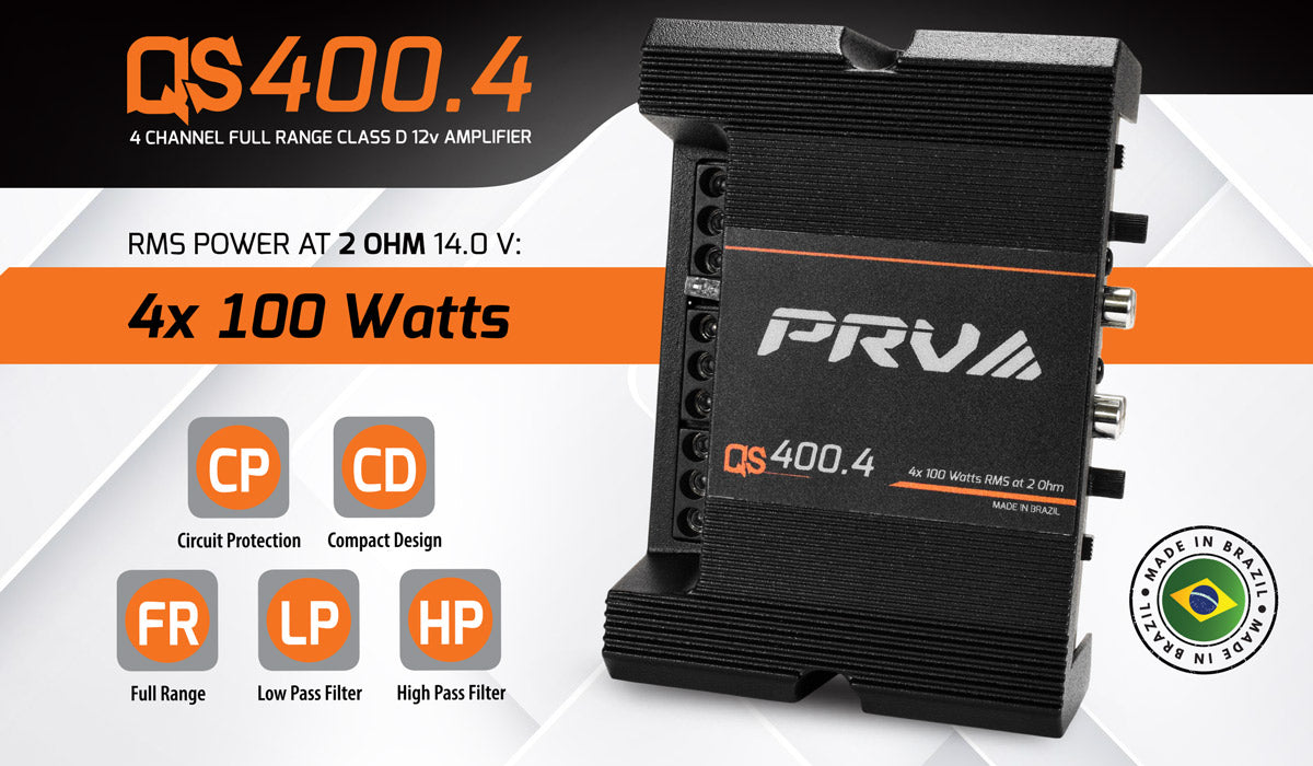 The QS400.4 features a regulated power supply that is able to constantly deliver power and provides an unsurpassed efficiency rate of 80–90% in a small aluminum heatsink.