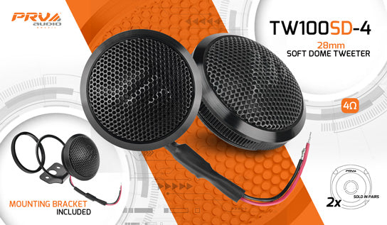 The Pair of TW100SD-4 silk dome tweeter (also referred to as a soft dome) is designed ideally for 2-way system, as an upgrade for that standard factory tweeter. It is the perfect balance between high fidelity sound and a compact design, making this 28 mm dome tweeter a preferred choice for high-end car sound systems.