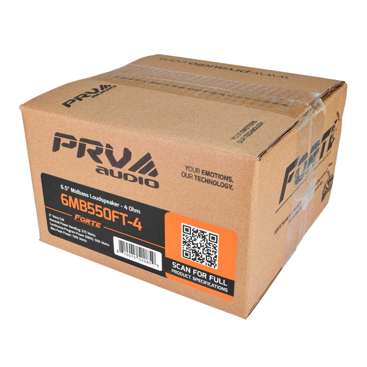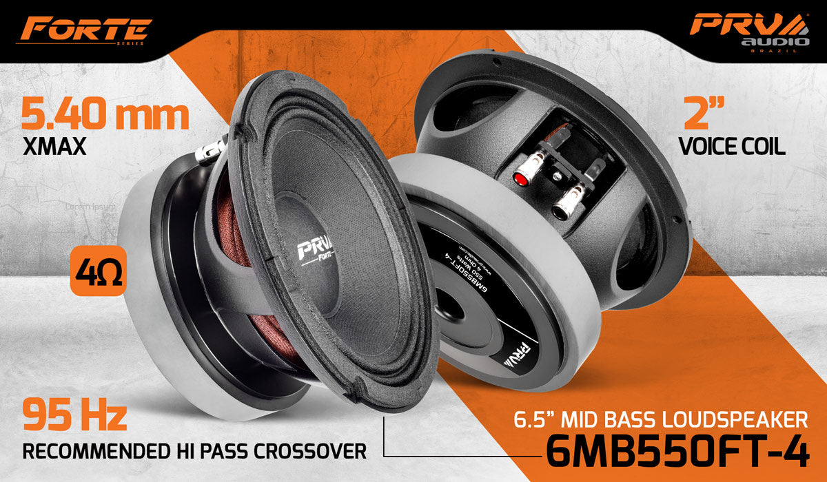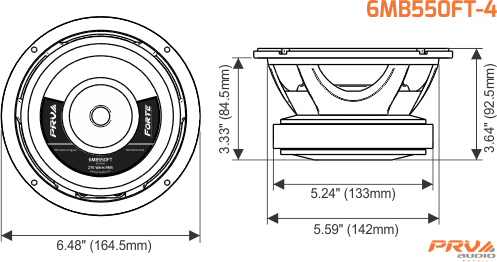 PRV Audio’s 6MB550FT-4 6.5″ Forte Series midbass was specially tailored to give you more Xmax and less distortion on mid low mid bass frequencies, with its Peak-to-Peak excursion going up to 14 mm (0.55″) this speaker can give a heck of a punch!
