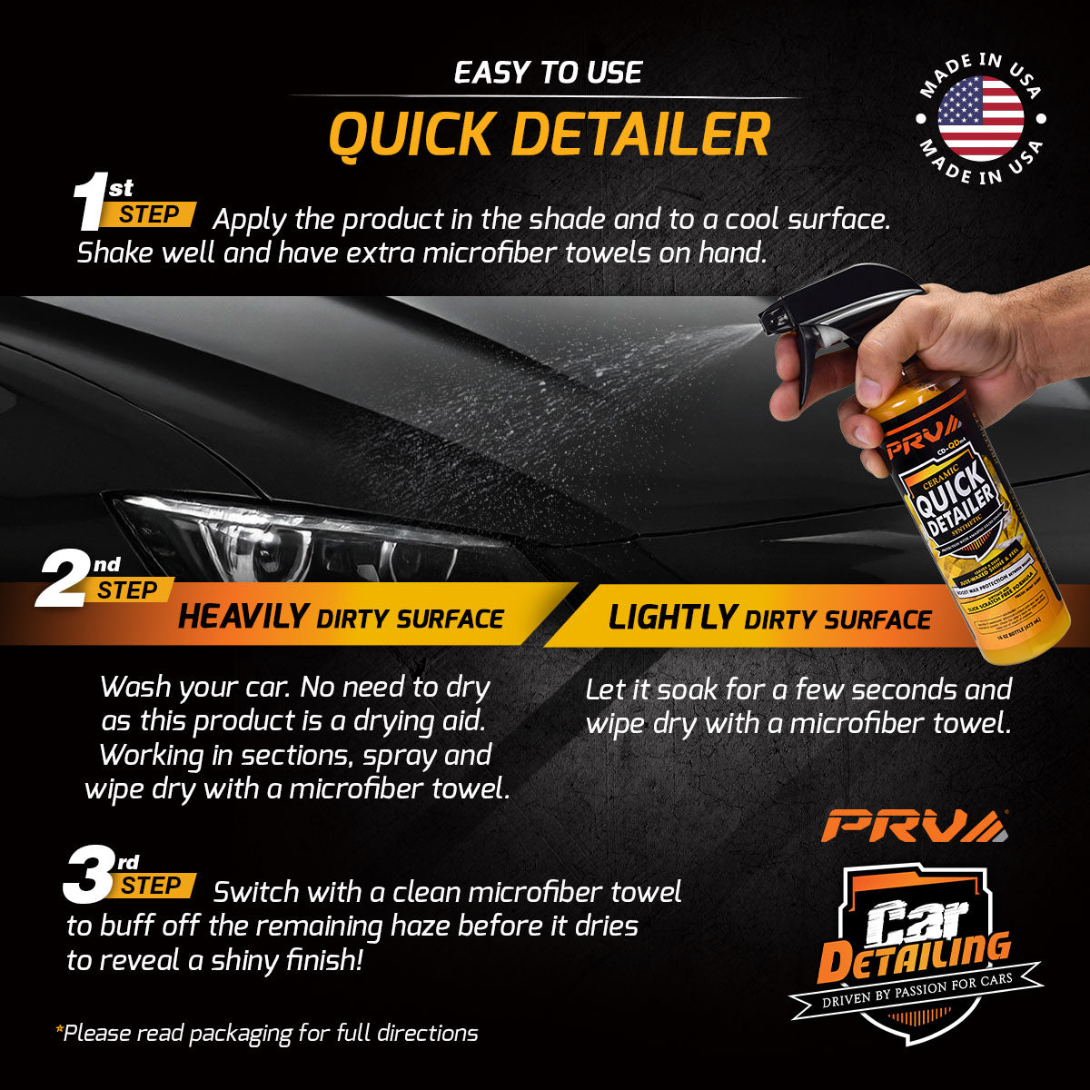 If you’re heading to a car show, the PRV Quick Detailer is a must-have. In only a few minutes, you can clean your car and enhance the look of it with a just waxed shine and feel.