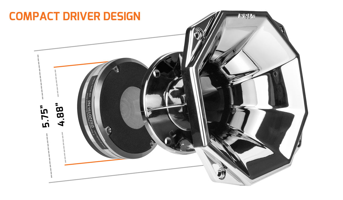 - Hybrid Titanium diaphragm with large 3″ Voice Coil, providing dynamic output along with excellent efficiency – 109 dB Sensitivity