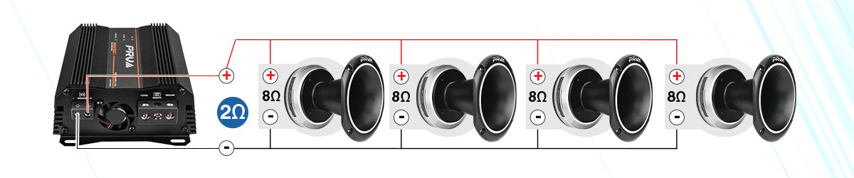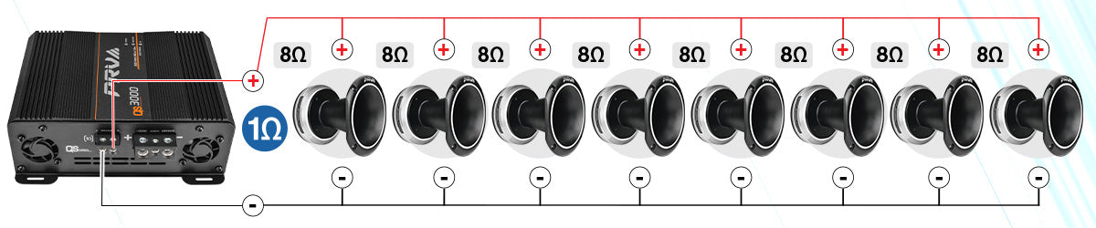 QS3000 at 1 Ohm – Wire 8 Drivers in parallel to the 1 channel amp at 1 Ohm.