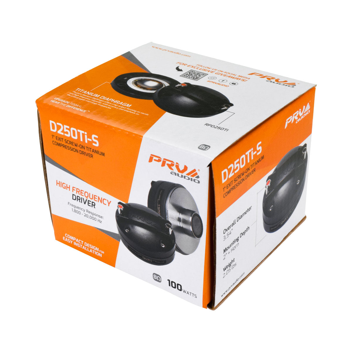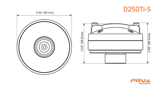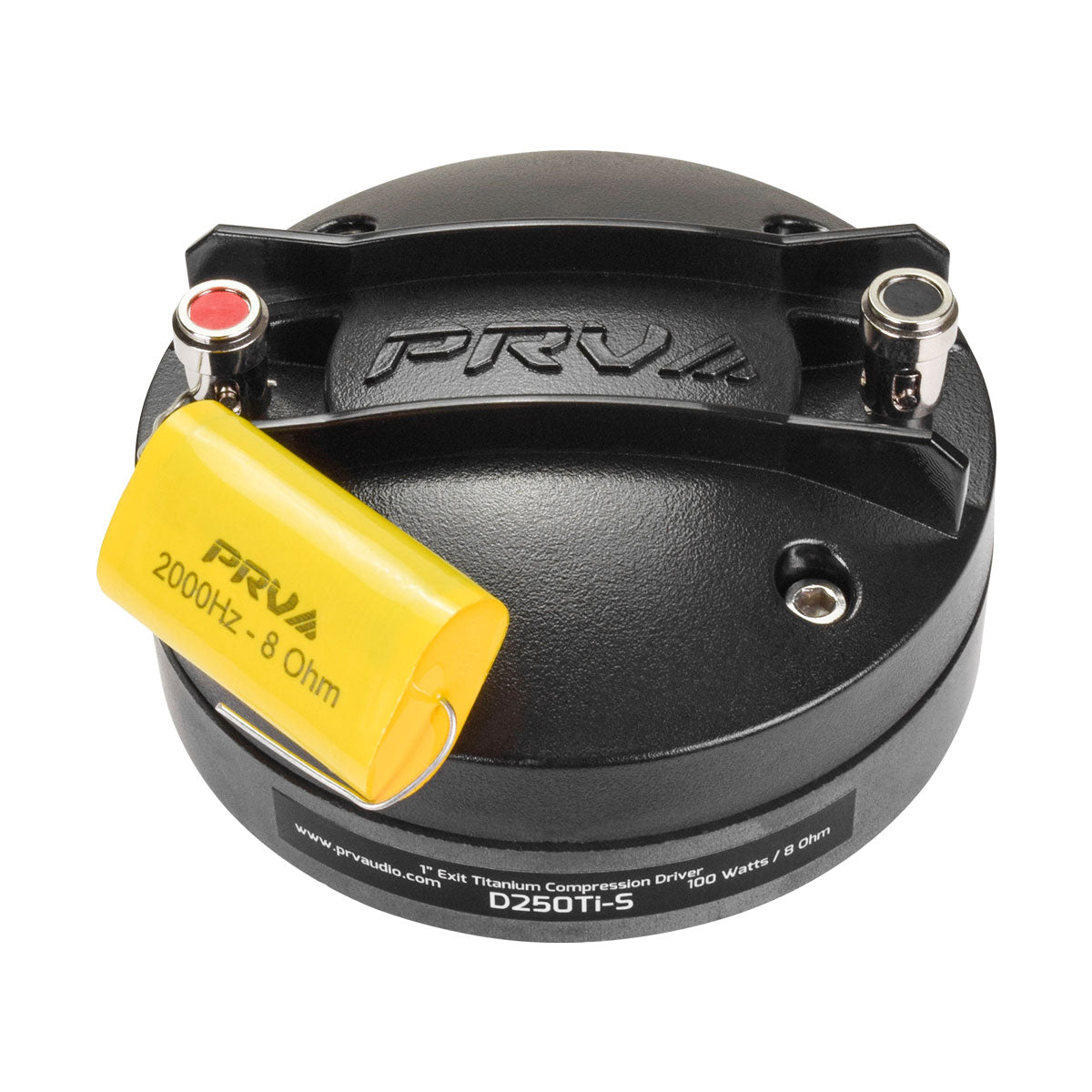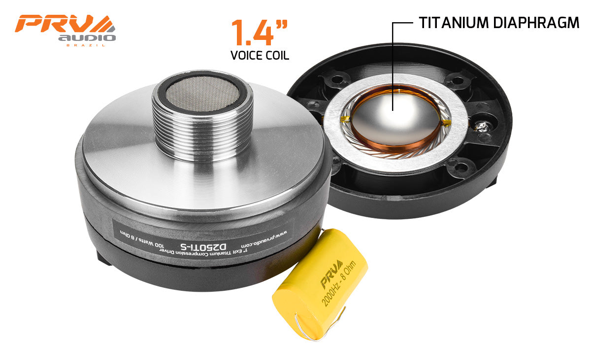 The titanium diaphragm is attached to a 1.4″ diameter copper-clad aluminum wire with Kapton® former for a 100 Watts RMS musical power handling, when used with recommended HPF using PRV Digital Signal Processor DSP