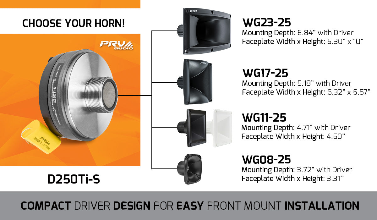 This compression driver is popular with audio enthusiasts due to its small diameter that works with a wide range of small horns. WG23-25 / WG17-25 / WG11-25 / WG08-25