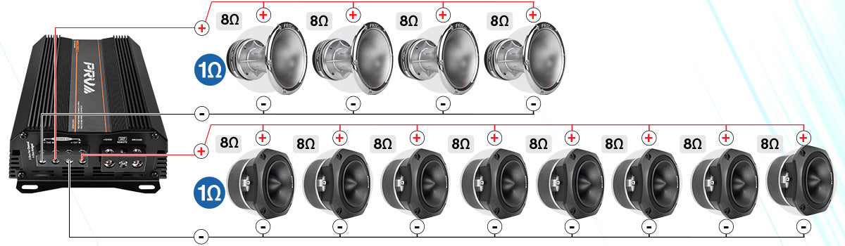 MDX2000.2 1 Ohm – Wire 8x Tweeters in parallel to CH1 and 4 or 8x Drivers in parallel to CH2.
