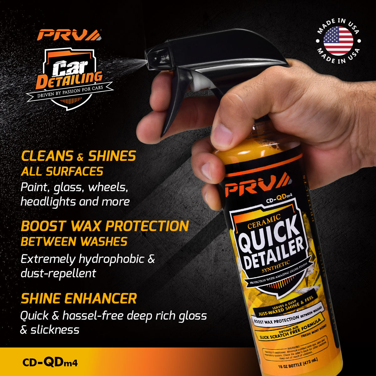 If you’re heading to a car show, the PRV Quick Detailer is a must-have. In only a few minutes, you can clean your car and enhance the look of it with a just waxed shine and feel.