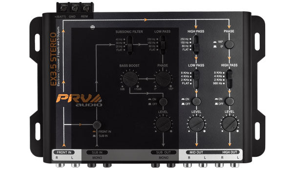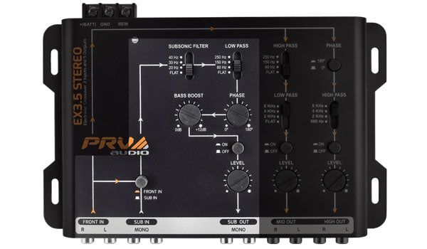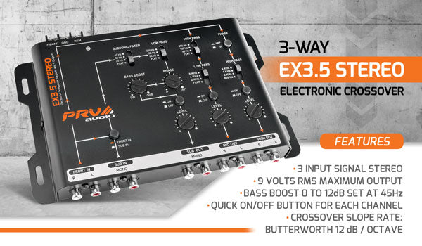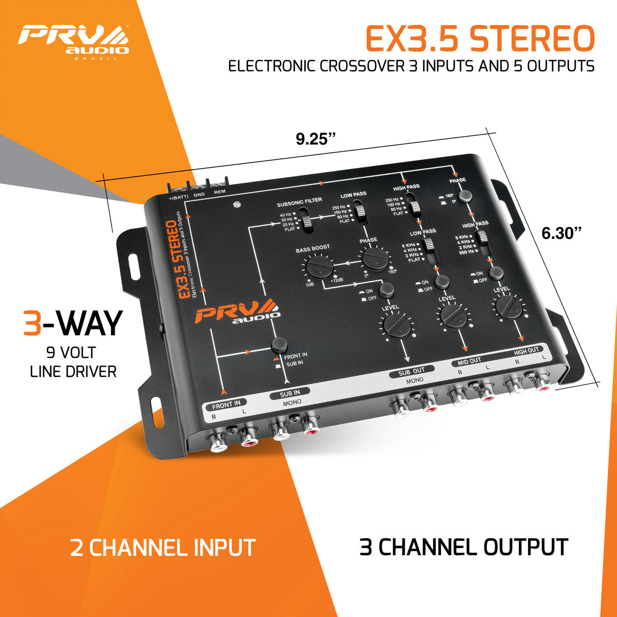 Bringing innovation and technology to the automotive sound market, PRV Audio launches the EX3.5 STEREO electronic crossover, giving you the power to customize your sound with a frequency of filter adjustments. Featuring 3-way adjustable HIGH PASS and LOW PASS filters and also output level control on each channel, plus adjustable BASS-BOOST option on the Sub Out channel. Enhancing Your Audio System!