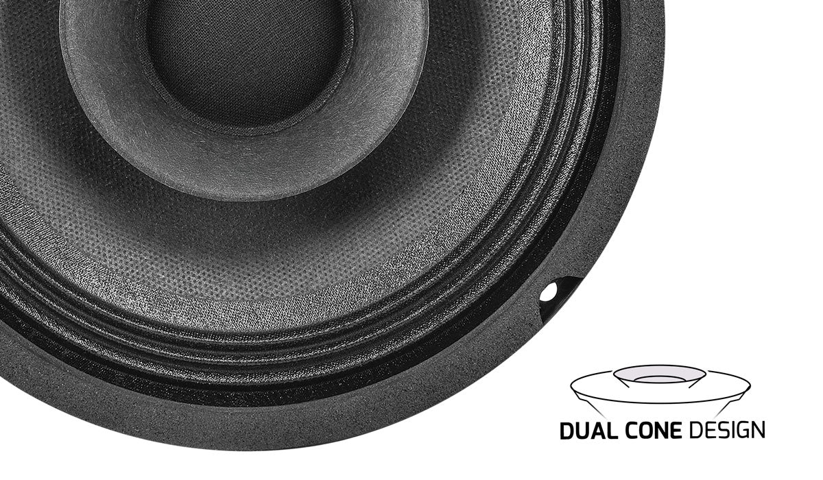 The dual cone setup maximizes sound clarity. The primary cone handles lows to midrange frequencies while the smaller whizzer cone increases high-frequency response, yet it still has a wide frequency range, 80Hz to 20,000Hz, despite its small size.