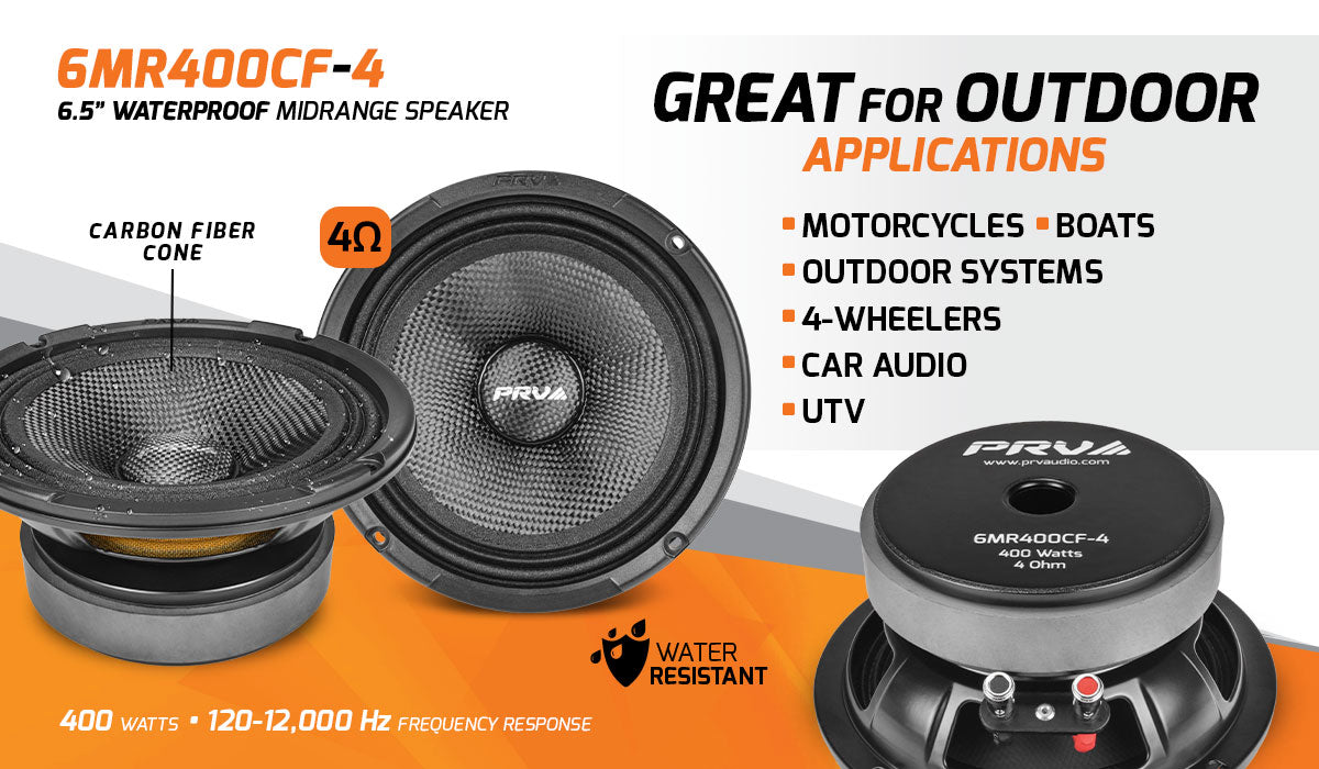 Ideal for upgrading your sound system in your boat, UTV, 4-wheeler, or motorcycle, this midrange speaker becomes the new standard in vocal reproduction for outdoor applications. Constructed of high-end materials like a carbon fiber cone, high-temperature voice coil, and huge neodymium magnet, this driver produces natural sound with remarkably low distortion.