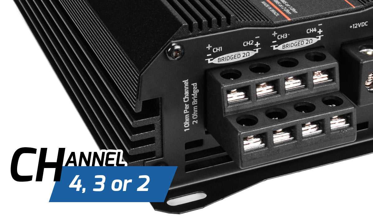 Its high power output with its multichannel technology eliminates the need for multiple amplifiers, when you can use this amplifier in 4, 3 or 2 channel configurations.