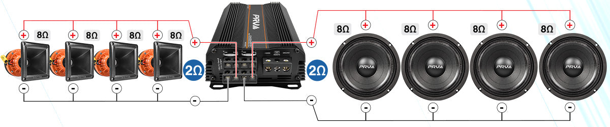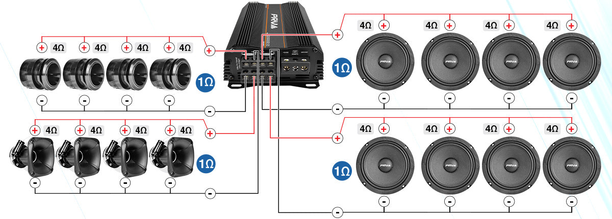 Its 1 Ohm channels allow you to install 16x 4 Ohm drivers or tweeters, 4 per channel in parallel, giving out 125 watts per component.