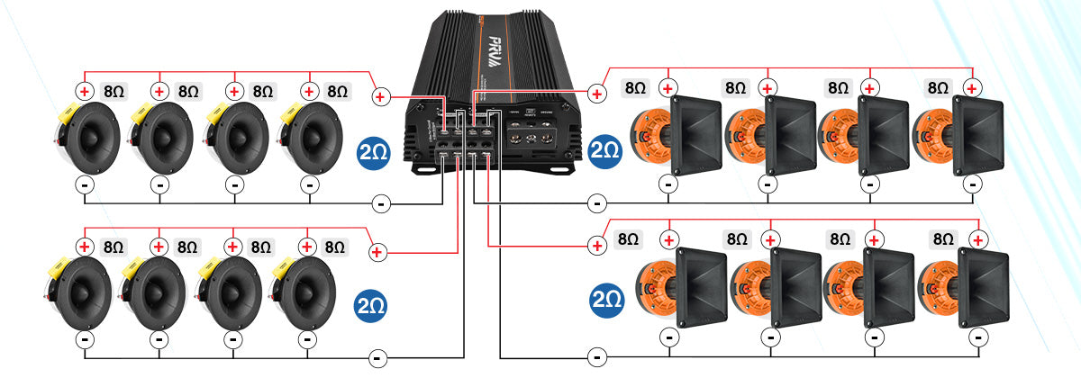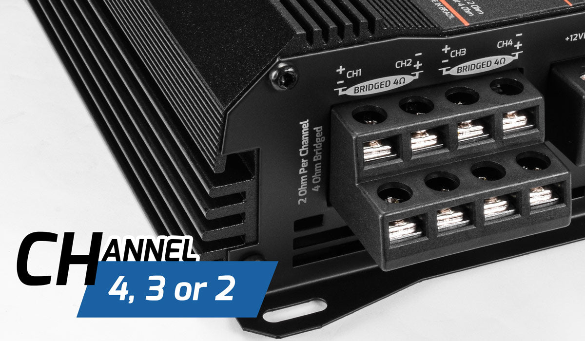 the need for multiple amplifiers, when you can use this amplifier in 4, 3 or 2 channel configurations.