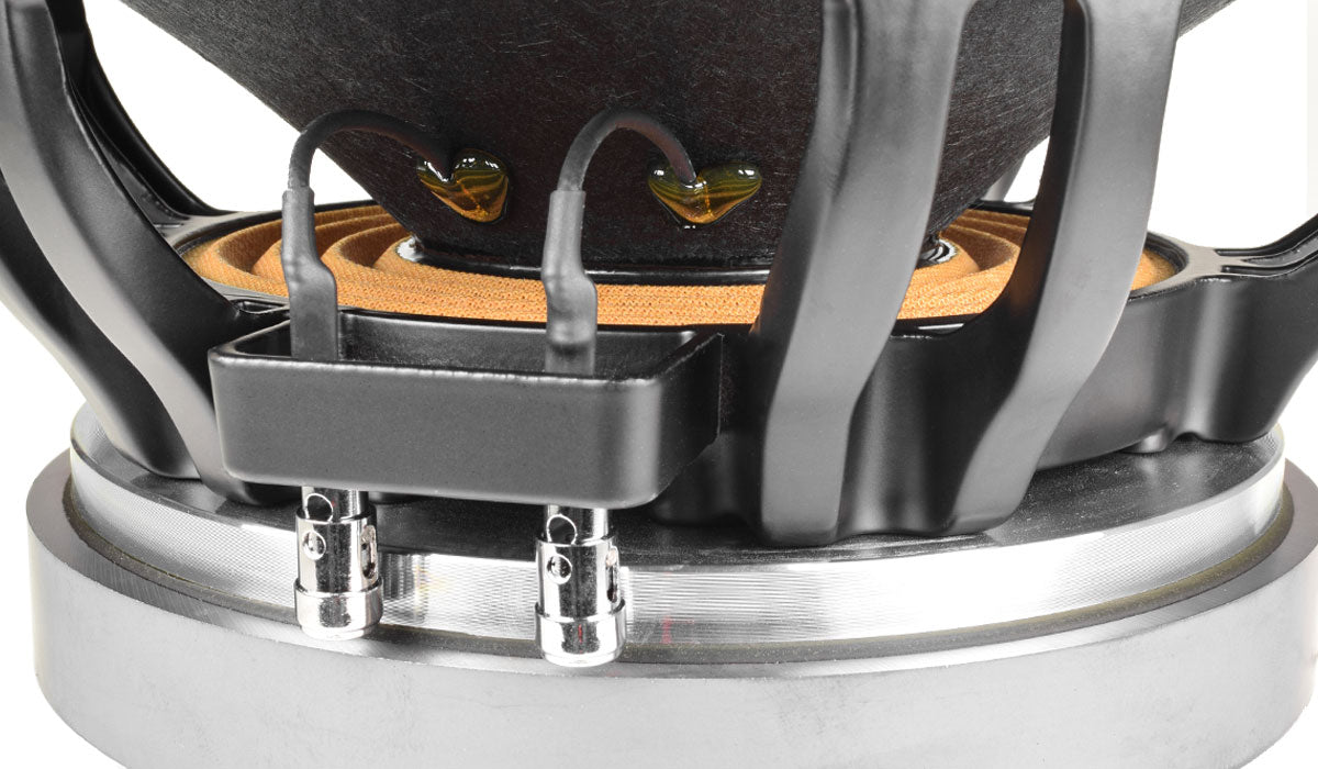 Cast aluminum frame adds structural integrity, while a paper/glass fiber cone attached to a large 3″ voice coil keeps everything under control at high level outputs, making an easy transition to a high frequency driver.