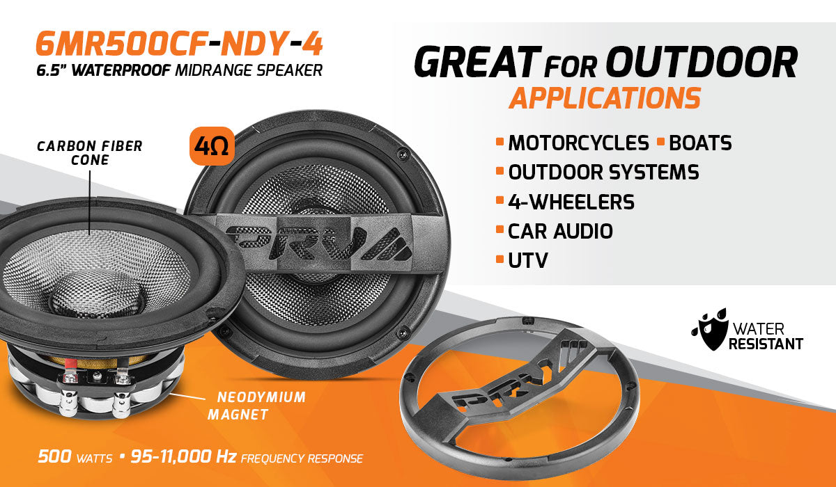 Ideal for upgrading your sound system in your boat, UTV, 4-wheeler, or motorcycle, this mid range speaker becomes the new standard in vocal reproduction for outdoor applications. Constructed of high-end materials like a carbon fiber cone, high-temperature voice coil, and huge neodymium magnet, this driver produces natural sound with remarkably low distortion.
