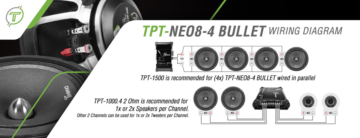 Install multiple speakers on a single system amplifier, you can easily wire 4x speakers in parallel to a TPT-1500 at 1 Ohm. Taking your custom system to the maximum output level, where you can drive with the windows down and still have your music heard over down on the block.