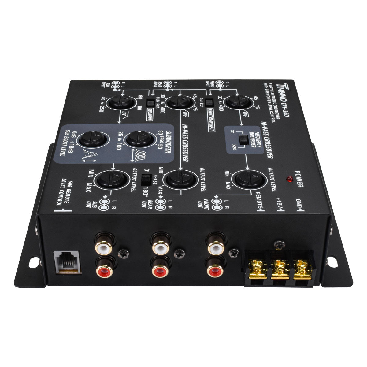 The TPT-360 is a full-feature three-way crossover. It can be used for 2-way systems with front and rear fade capability or for a full 3-way system. This electronic crossover allows you to choose from a wide range of crossover points between the front, rear and subwoofer outputs.