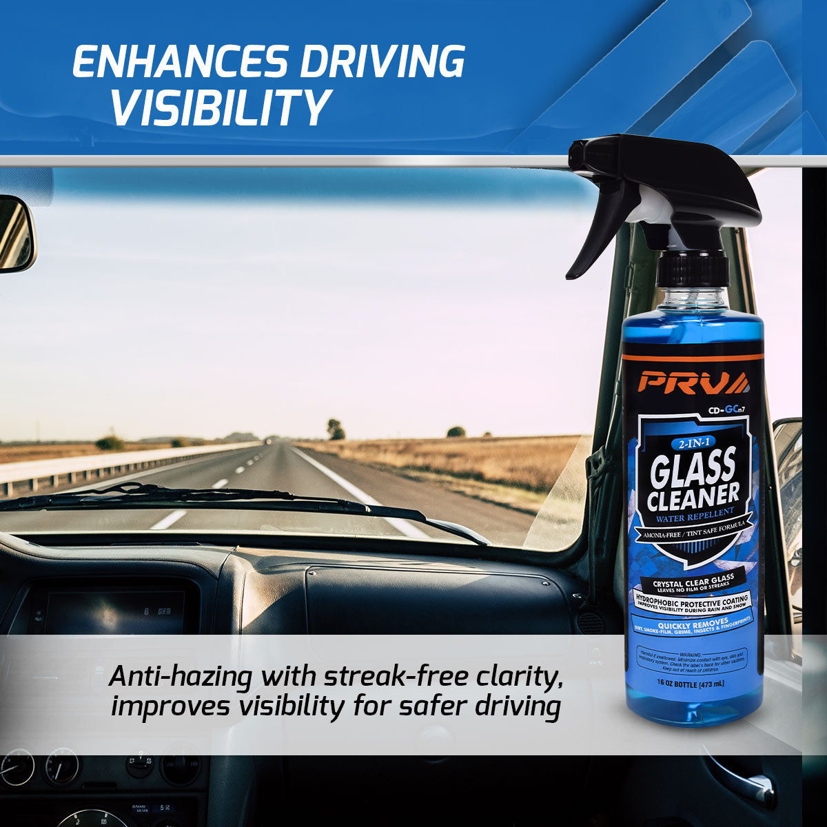 Experience the ultimate in clarity and protection with PRV’s Glass Cleaner and Water Repellent, engineered to keep your car’s glasses spotless and crystal clear. Using advanced cleaning technology, it cleans windows while leaving behind a hydrophobic layer of protection that causes water to bead and roll right off, keeping your view clear even in rain or snow.