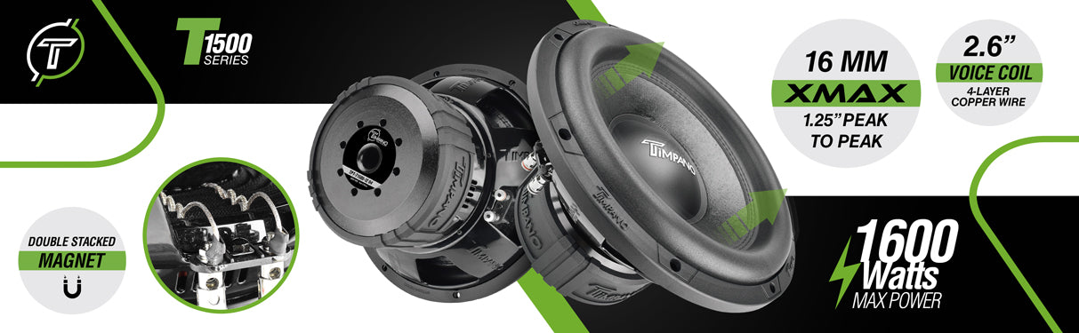 Timpano T1500 is a great entry point for a higher performance subwoofer that brings hard-hitting bass in a small powerful package. These subs will perform like a boss on a small amount of power, This keeps electrical upgrades minimal with less added strain on the vehicle. With high energy, double-stack motor paired with a high foam surround stitched to a heavy-duty competition-grade pressed paper cone which allows this woofer to play the low notes it was designed for.