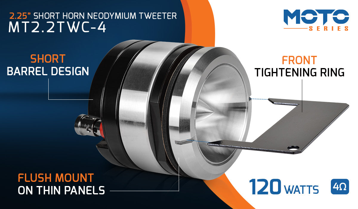 Our new MOTO Series (MT) super tweeters feature a new short horn design to provide a nice finishing touch to any motorcycle audio system without taking up much space. These products are available in two sizes and feature flexible mounting options for easy installation.