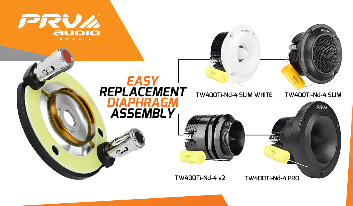 After several months of research and development, we were able to obtain a high level of output from this neodymium motor and an unique diaphragm design for the TW400Ti-Nd Series. Featuring a new concept, easy to replace diaphragm ( solderless ) makes a very easy task to fix your tweeter in few minutes.