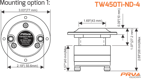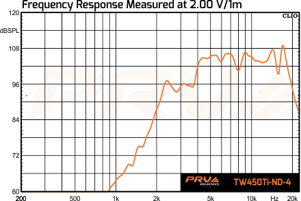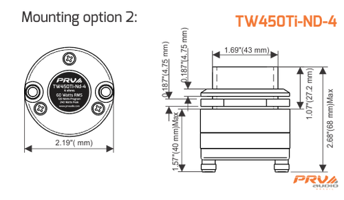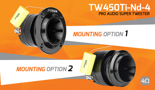 PRV Audio’s TW450Ti-Nd-4 super tweeter (also referred to as a bullet tweeter) is designed to add high output, high frequency response to any speaker system. The titanium diaphragm combines with the durable, yet lightweight, Kapton™ voice coil former for sensitivity levels of up to 107 dB from 4,500 to 20,000 Hz.