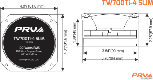 4-inch square high compression PRO bullet tweeter features flat sides allow for close side by side mounting. With high frequency response up to 20,000 Hz and a sensitivity of 105 dB at 1W/1m, the TW700Ti-4 SLIM can keep up with your custom door speaker system.