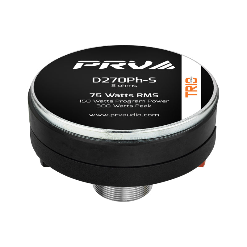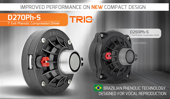 The latest addition to the TRIO By PRV 1” Exit phenolic family, the D270Ph-S is a new and improved compact driver that is all about high output and low distortion vocal reproduction all the way down to 500 Hz! This new driver is the perfect solution for use in high output PA and PRO audio on wheels systems.
