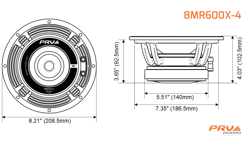 X-treme midrange performance is what PRV Audio’s 8MR600X-4 is all about. Made to be a class leading mid range in the car audio realm, this driver has a sensitivity of 98 dB and only weighs 7 pounds. This low frequency driver is optimized for custom car audio applications to perform best on very small enclosures, a pro audio version is available at 8ohms 8MR600X