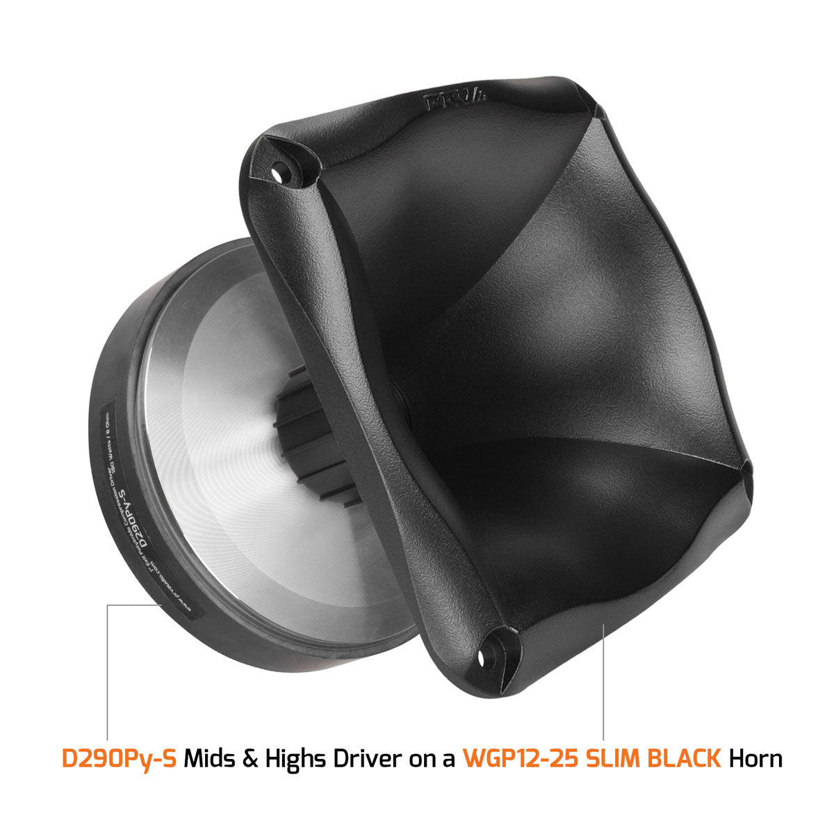 This high-output 2-way sound system is built with 2x 10MB500-4, 10″ loudspeakers, delivering deep, hard-hitting midbass with authority. A D290Py-S premium mids and highs compression driver on a WGP12-25 SLIM horn delivering crisp, crystal clear natural sound with a wide frequency response.