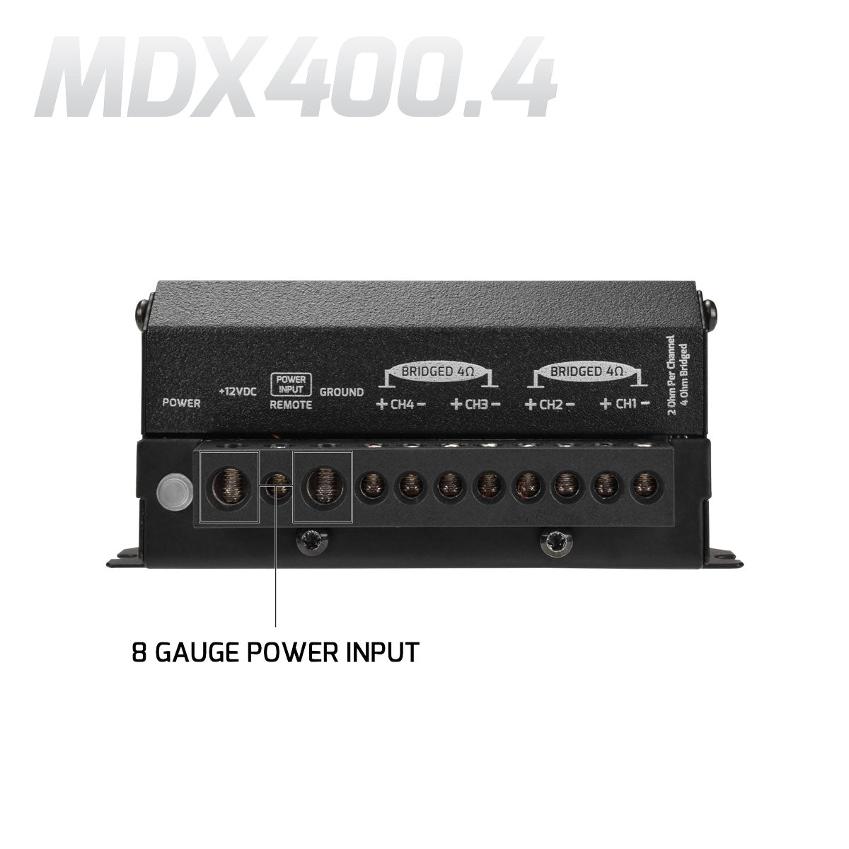 The mini MDX400.4 2 Ohm delivers 400 Watts RMS power over 4 channels in a compact, modern amplifier.