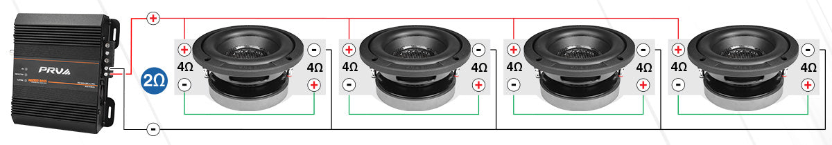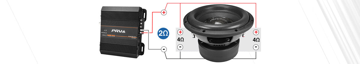 Configuration for DUAL 4 Ohm subwoofer, its high power output channel allow you to install 1x subs in parallel at 2 Ohm, giving up to 900 watts to the sub.