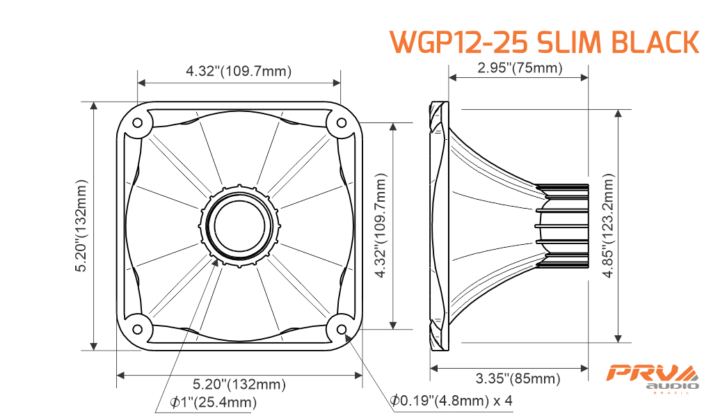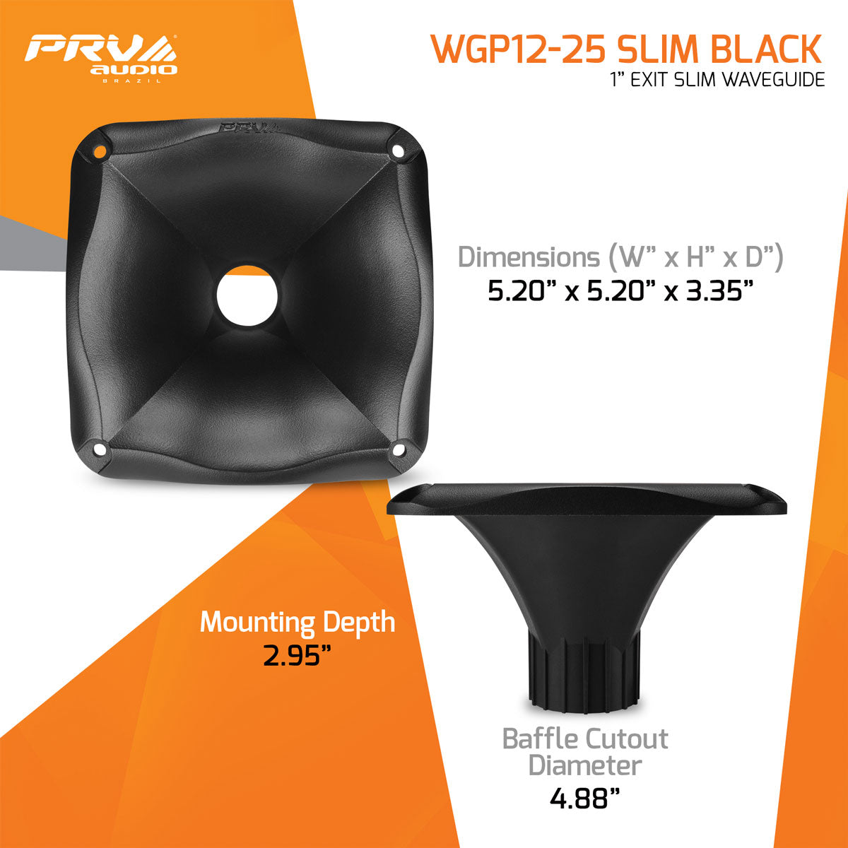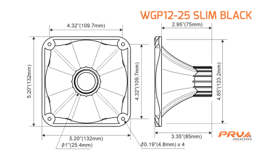 A standard 1-3/8″-18 TPI Screw on mount is compatible with any PRV 1″ exit screw-on compression drivers. The WGP12-25 SLIM is constructed from non-resonant ABS plastic, making it perfect for outdoor or automotive use. Acoustic loading is maintained down to 800 Hz.