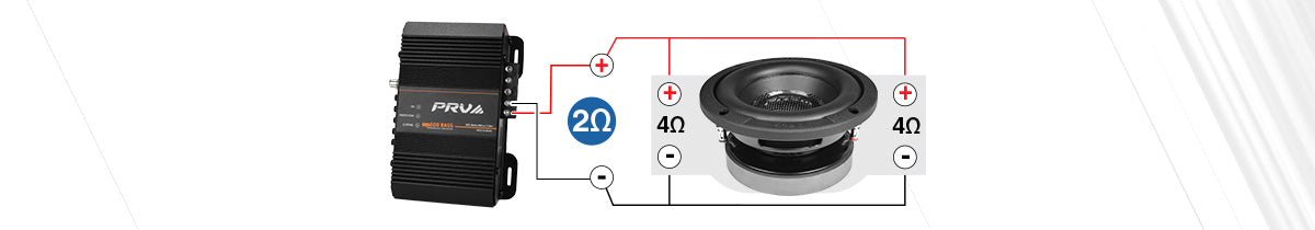 Configuration for DUAL 4 Ohm subwoofer, its high power output channel allow you to install 1x subs in parallel at 2 Ohm, giving up to 500 watts to the sub.