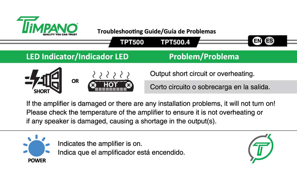 NOTE: In the event that the amplifier stops working, unplug the speakers and turn the equipment back on. If the problem persists, contact Timpano technical support through the online contact form at warranty